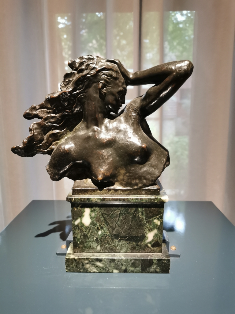 De ces trois sculptures qui m’ont plu (entre autres), deux sont de Charles Van der Stappen (1843-1910). Ce Sphinx en bronze (d’une collection privée) est antérieur au Sphinx mystérieux en argent et ivoire qui m’avait fascinée à l’exposition sur les magasins Wolfers au musée Art & Histoire. Les musées royaux comptent une version en marbre encore différente.