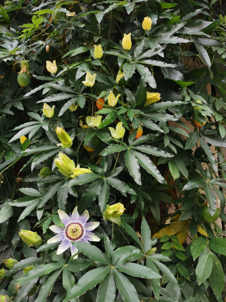 Quant à cette belle grimpante au doux nom de passiflore, rencontrée en chemin, elle réussit à présenter boutons, fleurs et fruits en même temps.