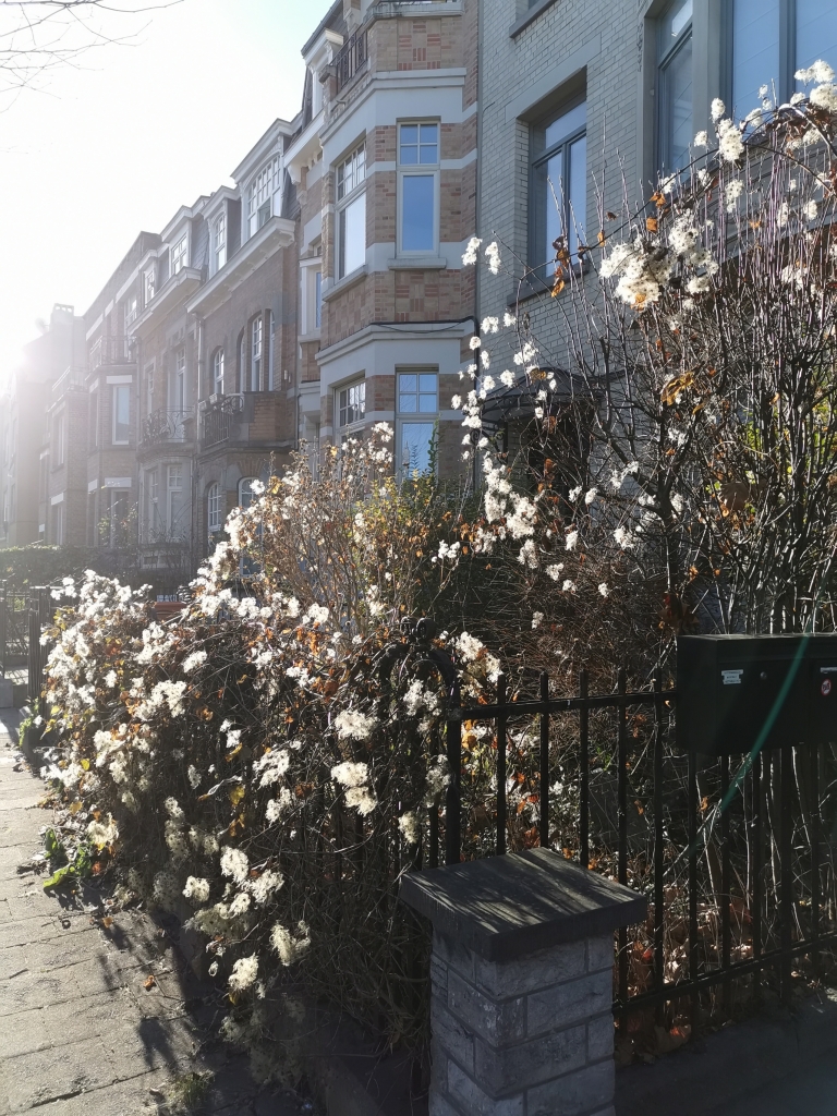 Ou cette guirlande de clématites à contre-jour qui accroche l’œil des promeneurs de l’après-midi. La plupart des jardinets hibernent, certains s’éclairent aussi quand portes et fenêtres décorées pour les fêtes deviennent lumières.