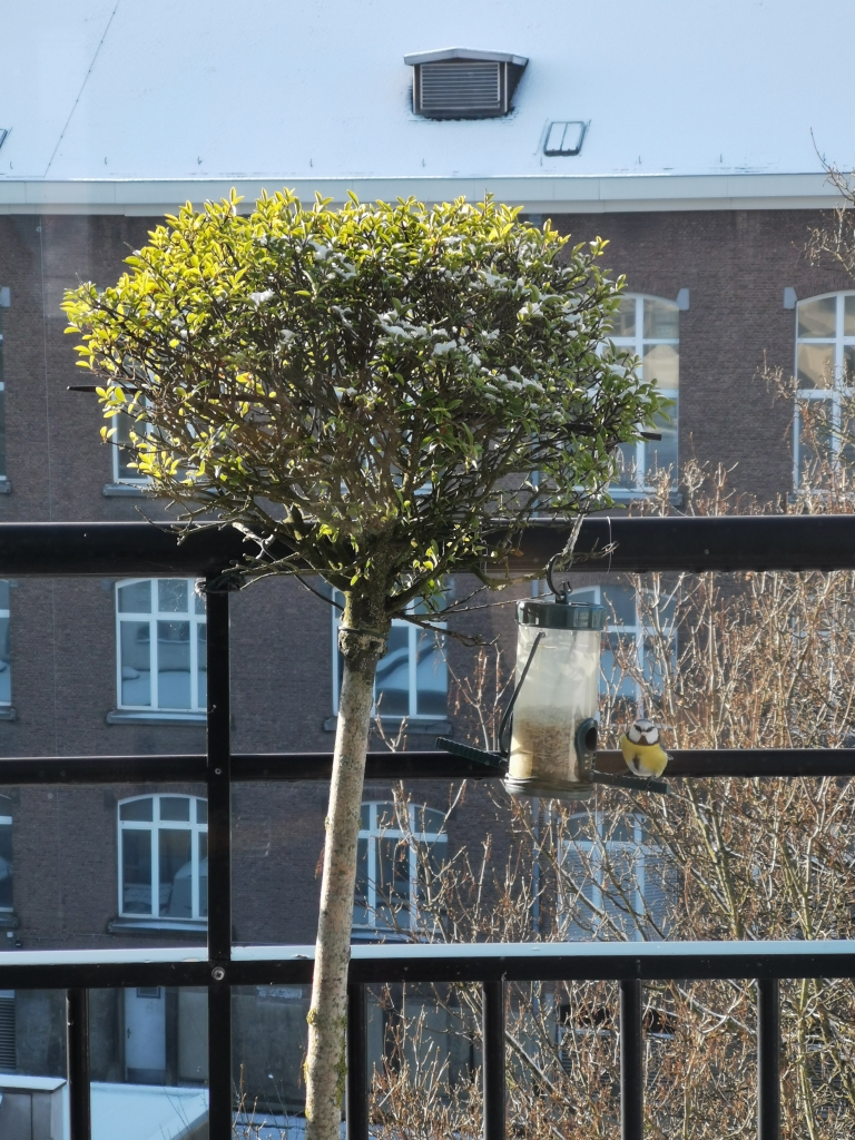 Mésanges charbonnières et mésanges bleues aiment venir en bande au silo et j’adore les voir s’accrocher par-ci par-là en attendant leur tour. Ces « rondes de mésanges », écrit Philippe Massart (Les oiseaux du parc Josaphat et de Schaerbeek), sont à la fois « une protection contre les prédateurs » et aussi « une aide dans la découverte de sources de nourriture ».