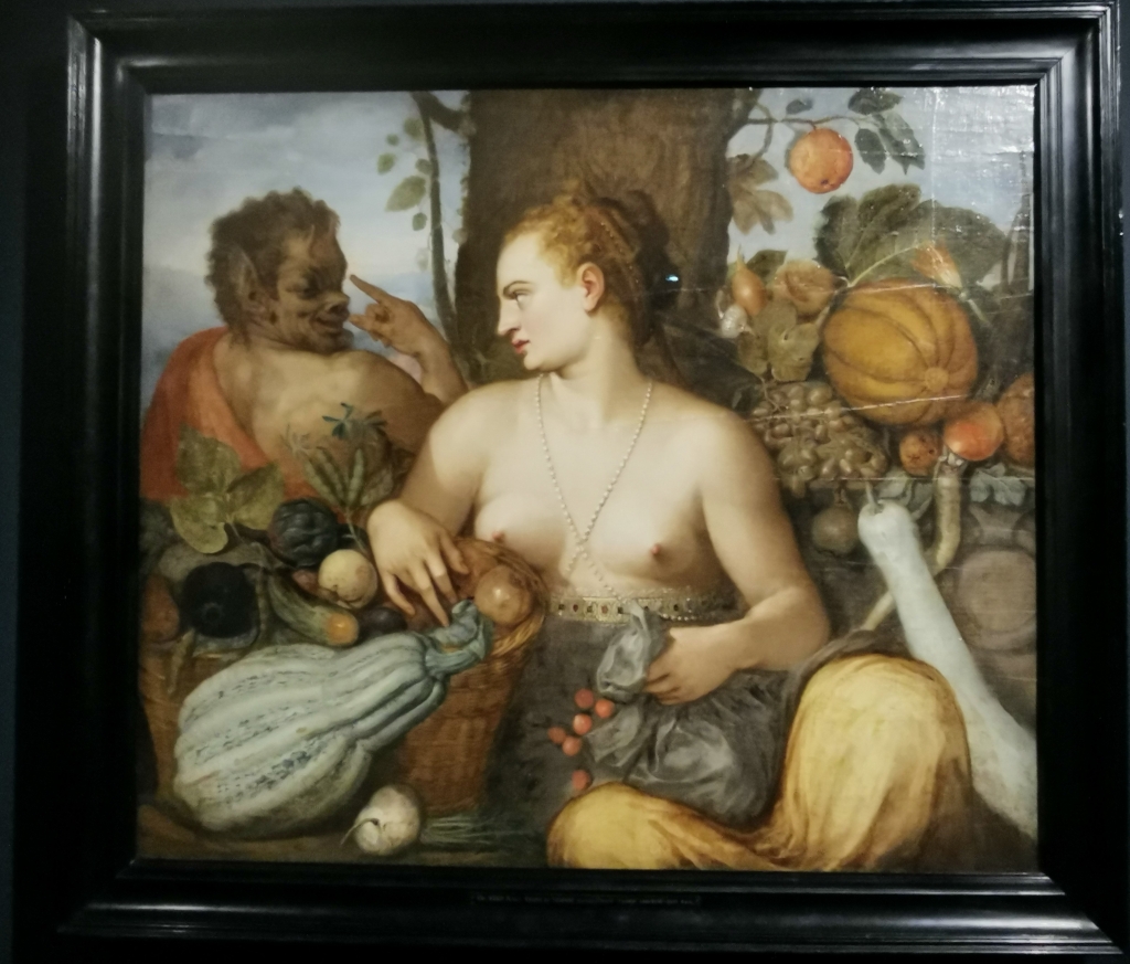 La dernière œuvre exposée montre une splendide Pomone (ci-dessous), divinité des fruits et des jardins, peinte par Frans Floris de Vriendt. Assise sous un arbre, elle est entourée de fruits dont la rondeur et les couleurs mettent sa poitrine dénudée en valeur au centre de la toile. Pan tourne vers elle son visage sombre et ricanant. « Les beautés et les laideurs se renforcent mutuellement », écrivait Léonard de Vinci.