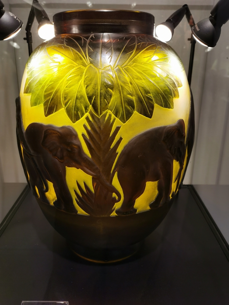 Au stand de BG Arts, qui rassemble des Lalique de toutes les couleurs, ce qui attire notre attention d’abord, c’est ce grand Vase aux éléphants d’Emile Gallé (Etablissements Gallé ?) qui se suivent à la queue leu leu autour d’un palmier. Ils se détachent en brun sur un fond jaune or, sous un feuillage vert. Très éclairé, superbe, on aimerait aussi voir ce vase impressionnant à la lumière du jour.